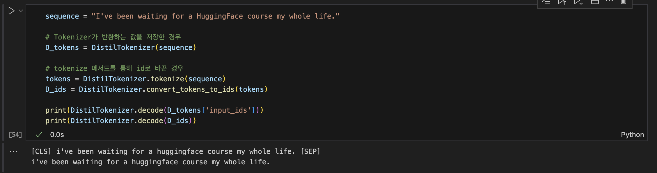 - ํ ํฌ๋์ด์ ๊ฐ ๋ฐํํ๋ ๊ฐ์ ๋ฐ๋ก ๋์ฝ๋ฉํ ๊ฒฝ์ฐ, CLS/SEP ๊ณผ ๊ฐ์ ํน์ ํ ํฐ๋ค์ด ์ถ๊ฐ๋๋ค.