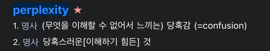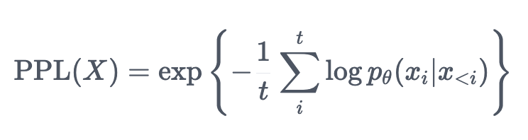 autoregressive, casual language model에서 자주 사용되는 퍼플렉시티(perplexity) 지표이다. 양방향을 고려하는 BERT와 같은 모델에서는 자주 사용되지 않는다.