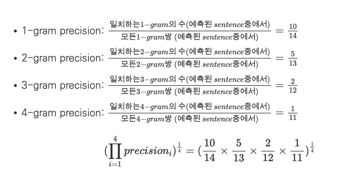 -> 둘을 합치면? 각 N-gram 에서의 precision을 구할 수 있다.