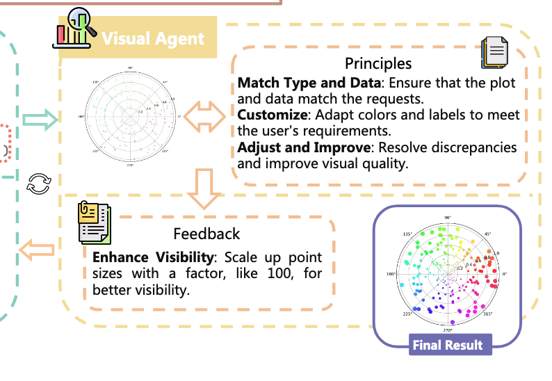 - 앞 단계에서 생성된 chart를 기반으로 multi-modal LLM을 활용해 visual feedback을 제공한다. feedback을 통해 Code Agent는 개선된 차트를 생성하게 된다.