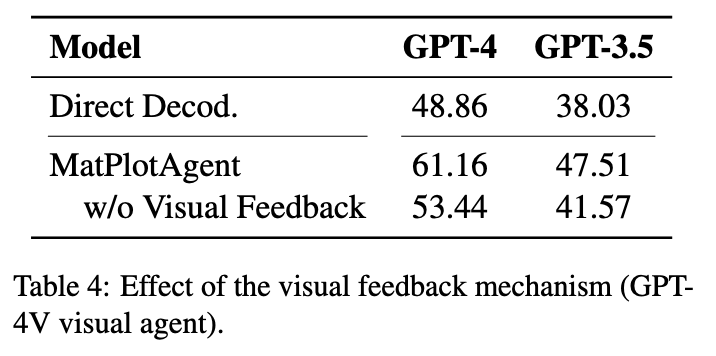 실제 결과에서도 MatPlotAgent의 방법론이 Direct decoding이나 CoT 접근에 비해 뛰어난 성능을 보였다(Table 1). model-agnostic하기에 여러 모델 환경 하에서 실험을 진행했으며, visual feedback mechanism의 ablation study를 통해 Nl2VIS 태스크에서 visual signal의 중요성을 나타냈다(Table 4).
